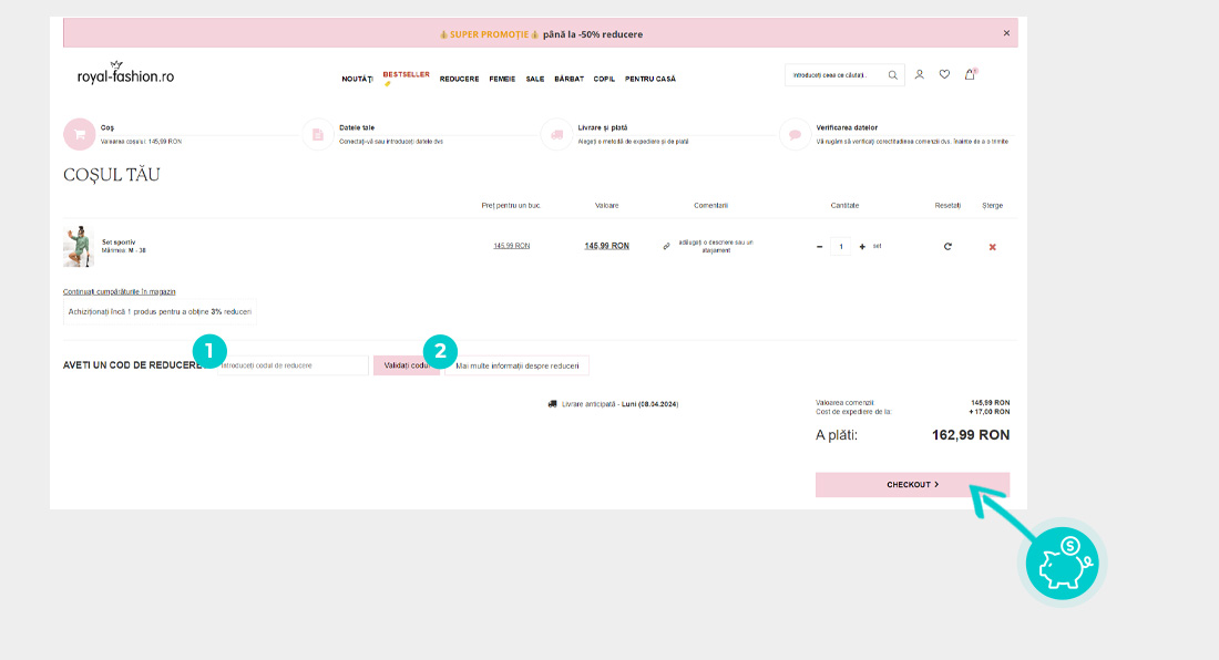 Alegeți produsul care vă interesează în magazinul online Royal Fashion.ro apăsați butonul „Adaugă în coș” și produsul se va introduce în coșul de cumpărături. În coșul de cumpărături sub produsul ales de dumneavoastră se află o rubrică „Introdu mai jos Codul!“. Aici veți introduce codul de reducere copiat sau îl transcrieți manual și confirmați prin butonul “Confirmă“.