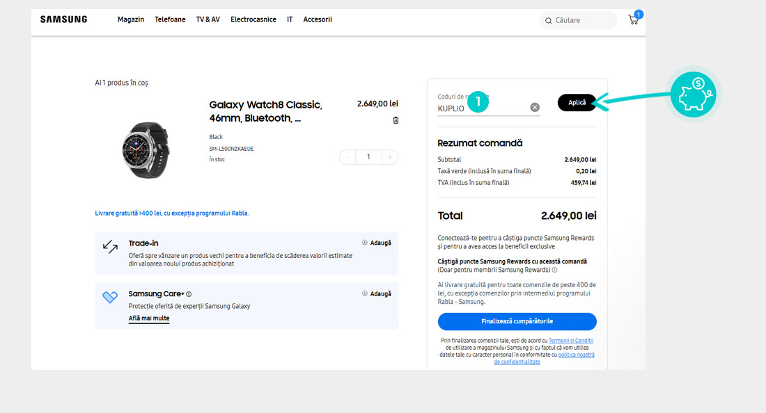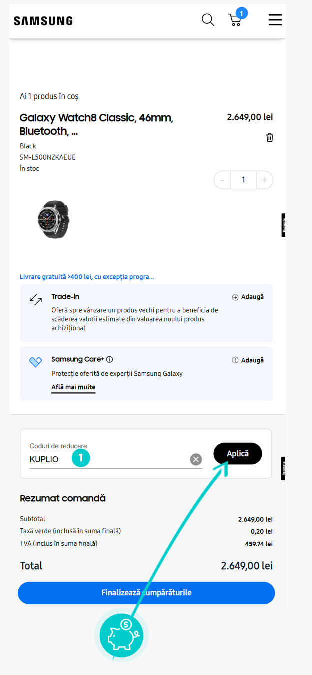 Alegeți produsul care vă interesează în magazinul online Samsung.ro apăsați butonul „Adaugă în coș” și produsul se va introduce automat în coșul de cumpărături. În coșul de cumpărături sub produsul ales de dumneavoastră se află o rubrică „Aplica un card cadou“. Aici veți introduce cod reducere copiat sau îl transcrieți manual și confirmați prin butonul “Aplică“.