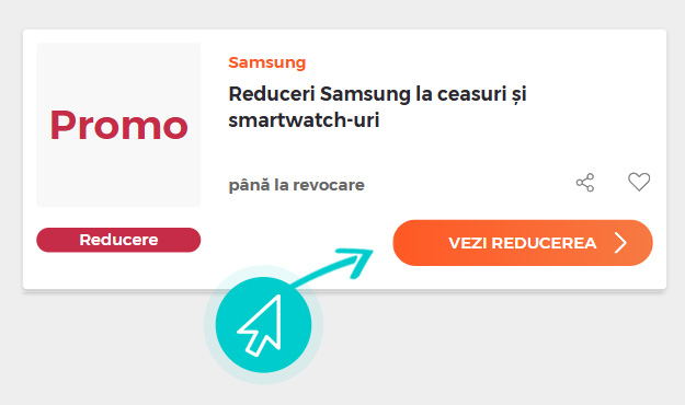 Alegeți o reducere Samsung concretă de pe pagina noastră faceți click pe „Vezi reducerea“ și veți fi redirecționați în mod automat în magazinul online Samsung.ro direct la oferta promoțională, de unde puteți cumpăra produsul dorit la reducere.