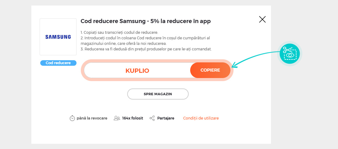Dacă nu vreți să ratați nici o ofertă, urmăriți portalul Kuplio.ro, unde sunt oferte actualizate zilnic. Puteți obține un cod reducere Samsung valabil direct pe site-ul magazinului sau de pe rețelele de socializare ale magazinului sau prin abonarea la Newsletter.