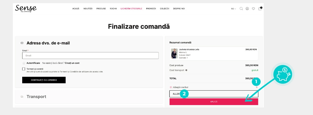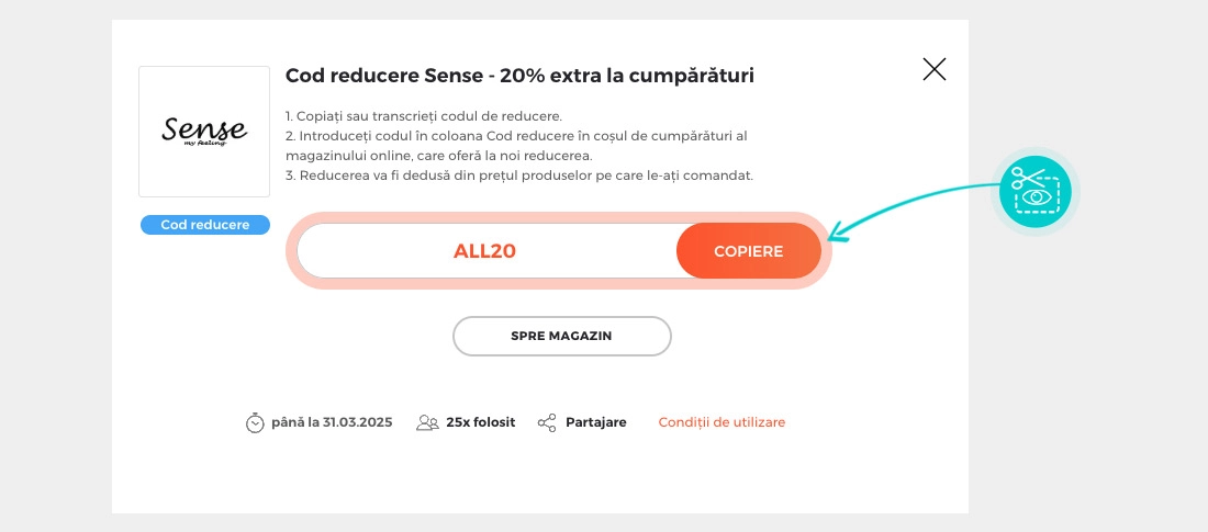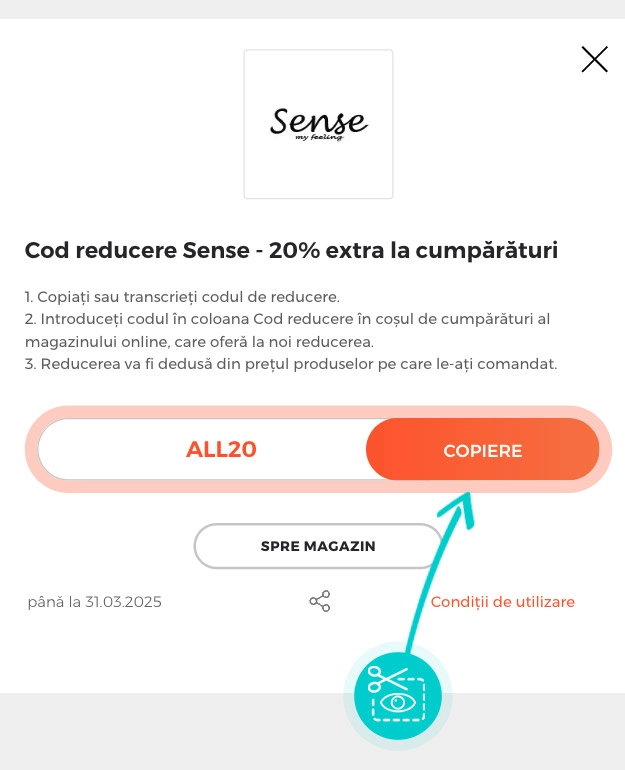 Copiați sau transcrieți codul de reducere și faceți click pe butonul portocaliu „Transfer în magazin“, ulterior veți fi redirecționat direct în magazinul online Fashionsense.ro.