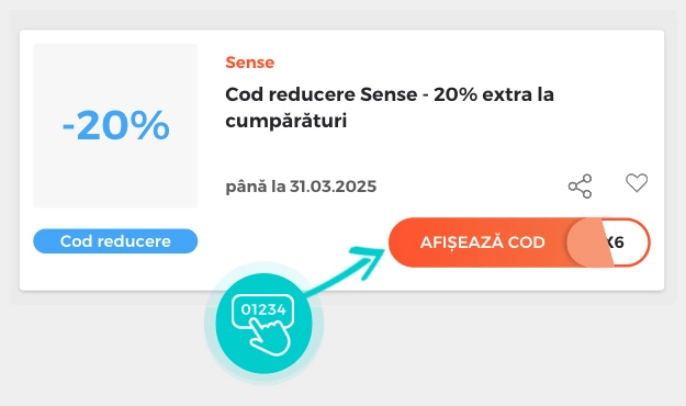 Valoarea reducerii: -20%În magazinul online Sense veți găsi reducere – 25% la cumpărături de peste 500 lei, selectate aflate la promoție.