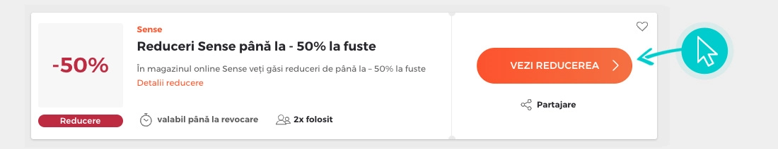 Selectați codul de reducere concret de pe pagina noastră, pe care doriți să-l aplicați în magazinul online Fashionsense.ro. Faceți click pe butonul portocaliu „Afișează codul”.