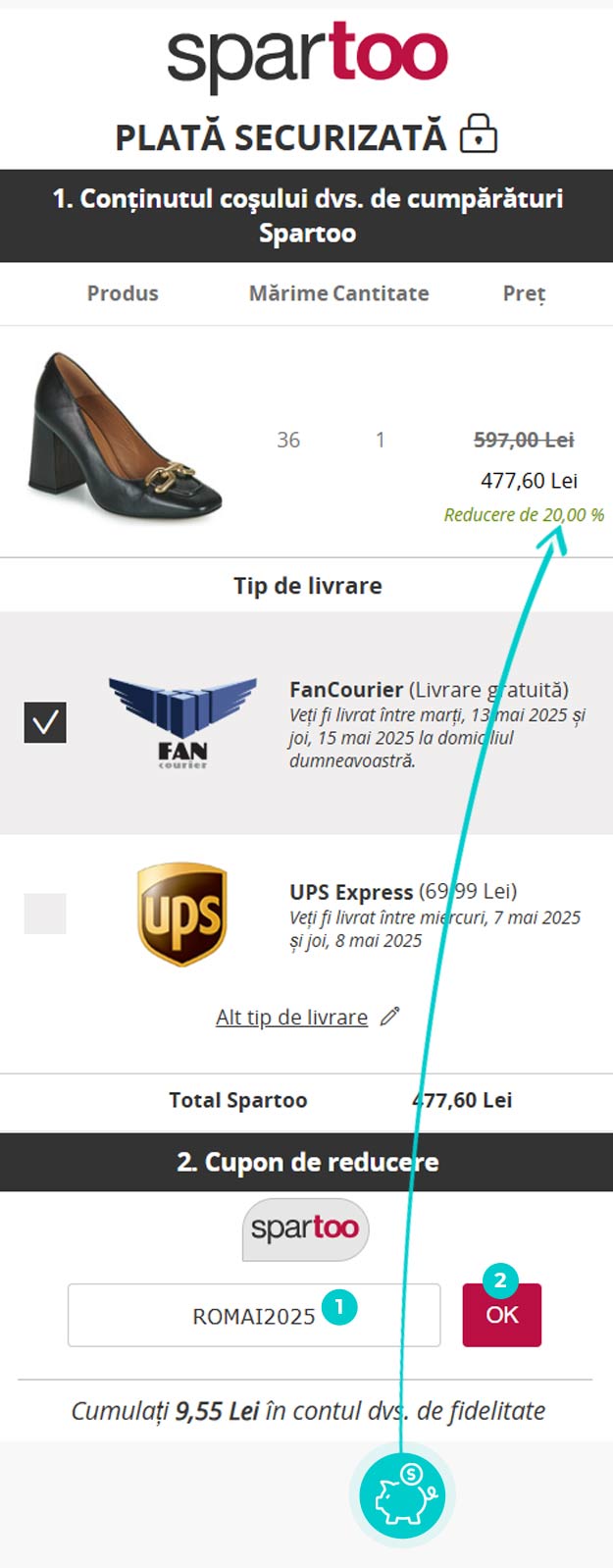 Copiați sau transcrieți cod reducere și faceți click pe butonul portocaliu „Transfer în magazin“, ulterior veți fi redirecționat direct în magazinul online Spartoo.ro.