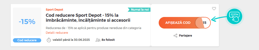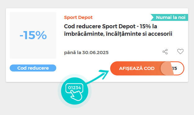 Selectați cod reducere concret de pe pagina noastră, pe care doriți să-l aplicați în magazinul online Sport Depot. Faceți click pe butonul portocaliu „Afișează codul”.