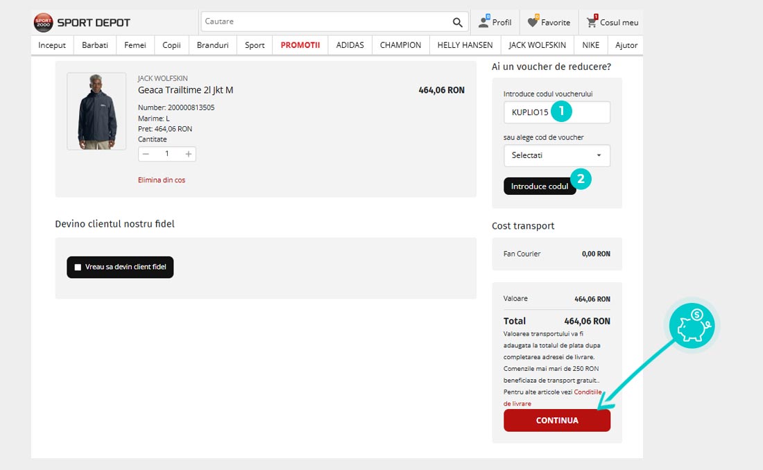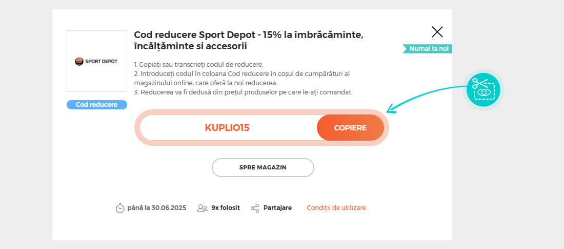 Copiați sau transcrieți cod reducere și faceți click pe butonul portocaliu „Transfer în magazin“, ulterior veți fi redirecționat direct în magazinul online Sport Depot.