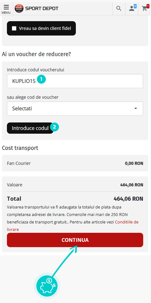 Alegeți produsul care vă interesează în magazinul online Sport Depot apăsați butonul „Adaugă în coș” și produsul se va introduce automat în coșul de cumpărături. În coșul de cumpărături sub produsul ales de dumneavoastră se află o rubrică „Ai un Voucher Cadou? Introdu codul aici“. Aici veți introduce cod reducere copiat sau îl transcrieți manual și confirmați prin butonul “Încarcă“.
