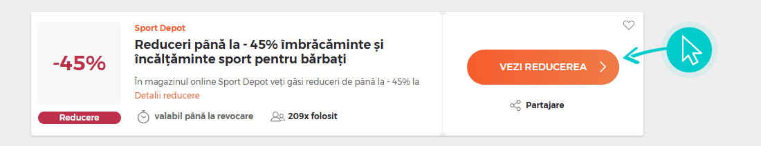 Alegeți o reducere Sport Depot concretă de pe pagina noastră faceți click pe „Vezi reducerea“ și veți fi redirecționați în mod automat în magazinul online Sport Depot direct la oferta promoțională, de unde puteți cumpăra produsul dorit la reducere.