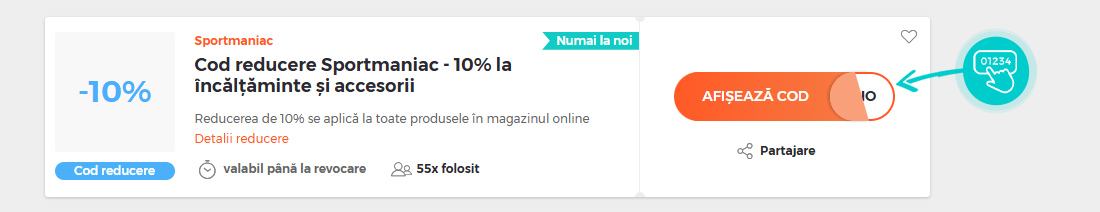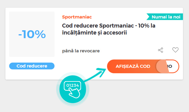 Selectați cod reducere concret de pe pagina noastră, pe care doriți să-l aplicați în magazinul online Sportmaniac.ro. Faceți click pe butonul portocaliu „Afișează codul”.