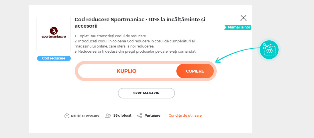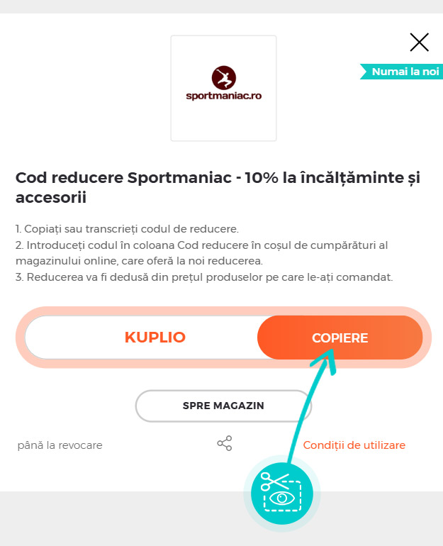 Copiați sau transcrieți cod reducere și faceți click pe butonul portocaliu „Transfer în magazin“, ulterior veți fi redirecționat direct în magazinul online Sportmaniac.ro.