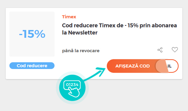 Selectați cod reducere concret de pe pagina noastră, pe care doriți să-l aplicați în magazinul online Timex.ro. Faceți click pe butonul portocaliu „Afișează codul”.
