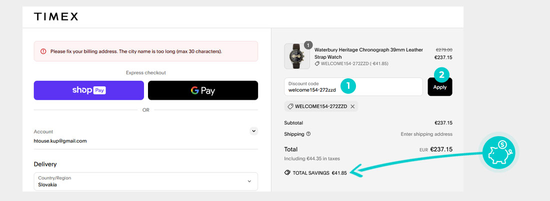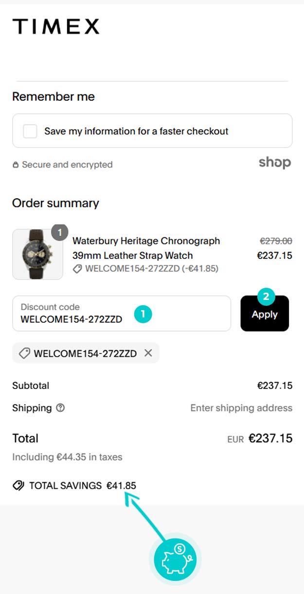Alegeți produsul care vă interesează în magazinul online Timex.ro apăsați butonul „Adaugă în coș” și produsul se va introduce în coșul de cumpărături. În coșul de cumpărături sub produsul ales de dumneavoastră se află o rubrică „Am voucher cadou sau un cod special“. Aici veți introduce cod reducere copiat sau îl transcrieți manual și confirmați prin butonul “Folosește“.