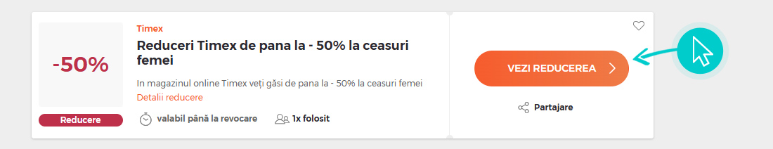 Alegeți o reducere Timex concretă de pe pagina noastră faceți click pe „Vezi reducerea“ și veți fi redirecționați în mod automat în magazinul online Timex.ro direct la oferta promoțională, de unde puteți cumpăra produsul dorit la reducere.