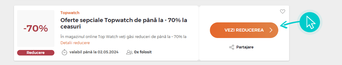 Alegeți o reducere Topwatch concretă de pe pagina noastră faceți click pe „Vezi reducerea“ și veți fi redirecționați în mod automat în magazinul online Topwatch.com direct la oferta promoțională, de unde puteți cumpăra produsul dorit la reducere.