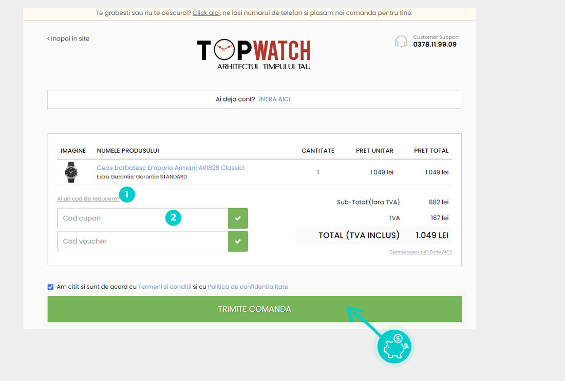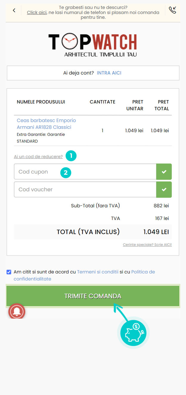 Alegeți produsul care vă interesează în magazinul online Topwatch.com apăsați butonul „Adaugă în coș” și produsul se va introduce în coșul de cumpărături. În coșul de cumpărături sub produsul ales de dumneavoastră se află o rubrică „Introdu mai jos Codul!“. Aici veți introduce codul de reducere copiat sau îl transcrieți manual și confirmați prin butonul “Confirmă“.