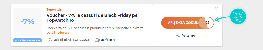 Selectați codul de reducere concret de pe pagina noastră, pe care doriți să-l aplicați în magazinul online Topwatch.ro. Faceți click pe butonul portocaliu „Afișează codul”.