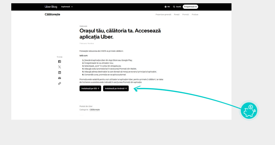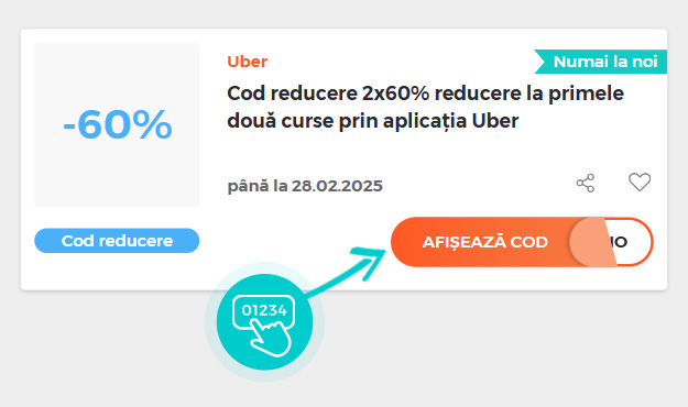 Promoție de 2x60% la primele două curse prin aplicația Uber. Pentru mai multe informații, faceți clic aici.