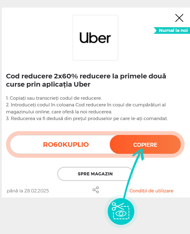 Copiați sau transcrieți cod reducere și faceți click pe butonul portocaliu „Transfer în magazin“, ulterior veți fi redirecționat direct pe platforma online sau în aplicația Uber.
