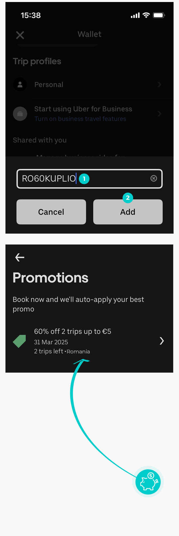 Codul de reducere poate fi utilizat numai în aplicația pe care o descărcați de la magazin pe telefonul dvs. După ce v-ați creat un cont, deschideți contul dvs. unde veți găsi opțiunea „Cupoane”. O casetă de text se va deschide automat pentru a introduce codul. Introduceți aici un cod de reducere valabil sau introduceți-l manual și faceți clic pe „Adaugă”. Codul de reducere a fost adăugat în contul dvs. și va fi aplicat automat la cursa dvs. atunci când vă rezervați călătoria.