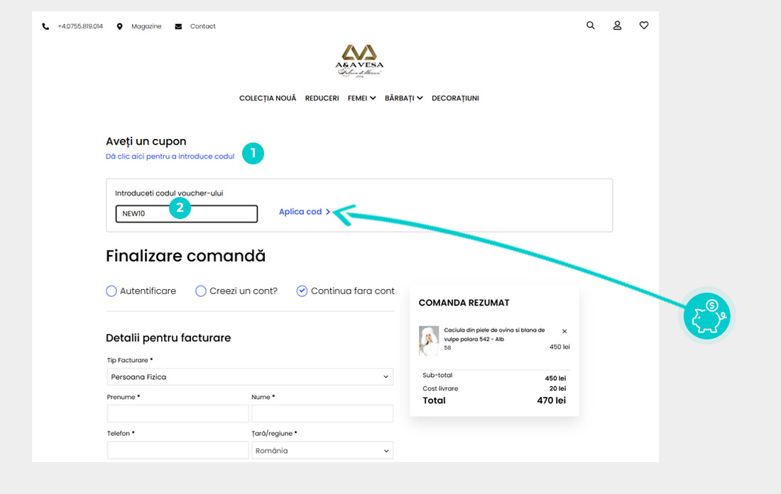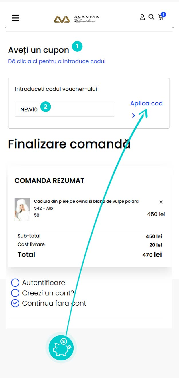 Alegeți produsul care vă interesează în magazinul online A&A Vesa.ro apăsați butonul „Adaugă la coș” și produsul se va introduce automat în coșul de cumpărături. În coșul de cumpărături sub produsul ales de dumneavoastră se află o rubrică „Am un cod promo“. Aici veți introduce cod reducere copiat sau îl transcrieți manual și confirmați prin butonul “Folosește“.