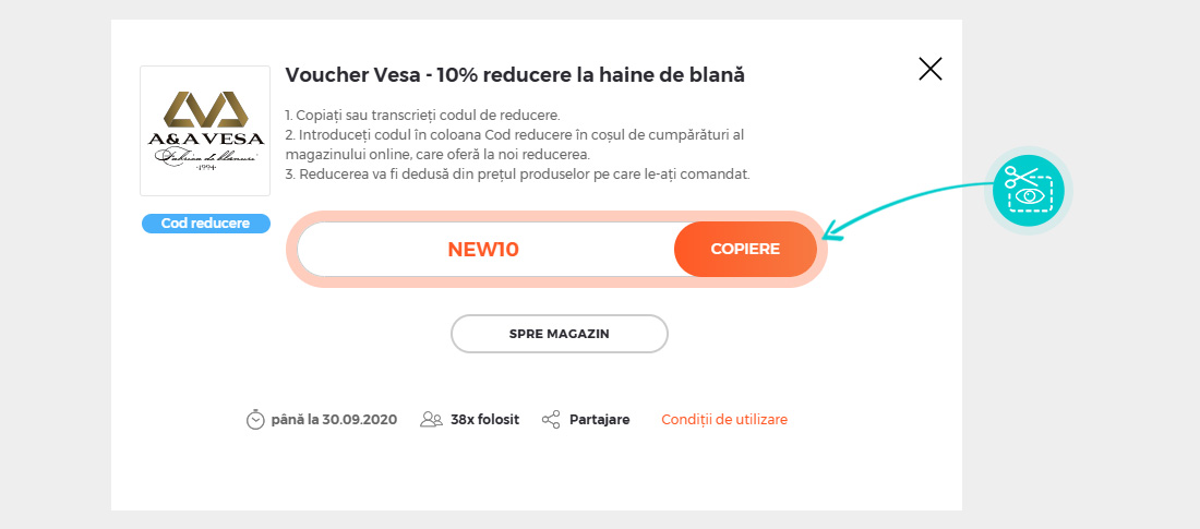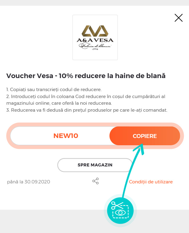 Copiați sau transcrieți cod reducere și faceți click pe butonul portocaliu „Transfer în magazin“, ulterior veți fi redirecționat direct în magazinul online A&A Vesa.ro.