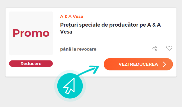 Alegeți o reducere A&A Vesa concretă de pe pagina noastră faceți click pe „Vezi reducerea“ și veți fi redirecționați în mod automat în magazinul online A&A Vesa.ro direct la oferta promoțională, de unde puteți cumpăra produsul dorit la reducere.