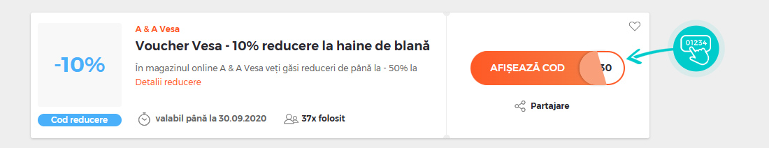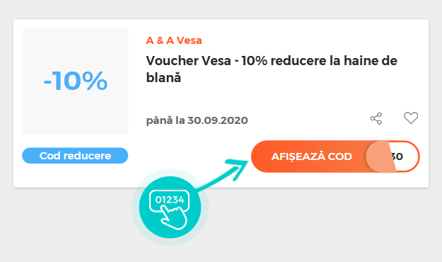 Selectați cod reducere concret de pe pagina noastră, pe care doriți să-l aplicați în magazinul online A&A Vesa.ro. Faceți click pe butonul portocaliu „Afișează codul”.