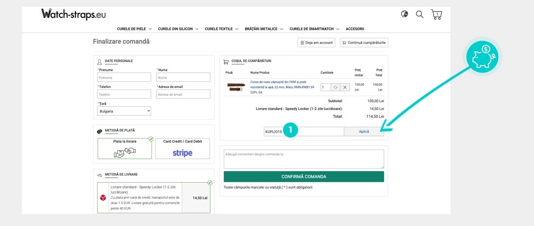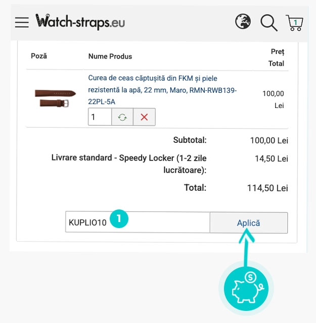 Alegeți produsul care vă interesează în magazinul online Watch-Straps apăsați butonul „Adaugă în coș” și produsul se va introduce automat în coșul de cumpărături. În coșul de cumpărături sub produsul ales de dumneavoastră se află o rubrică „Ai un Voucher Cadou? Introdu codul aici“. Aici veți introduce cod reducere copiat sau îl transcrieți manual și confirmați prin butonul “Încarcă“.