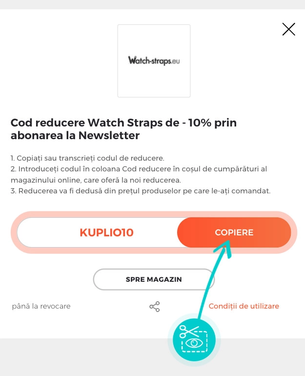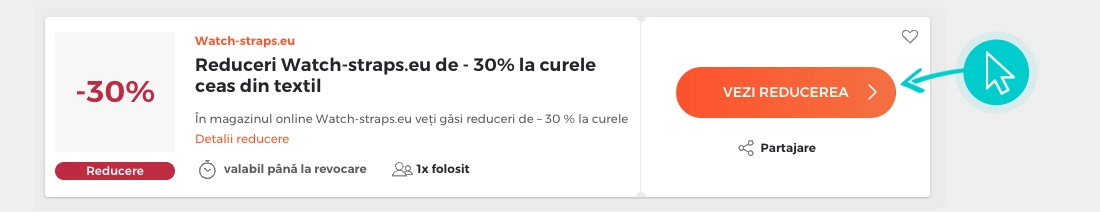 Selectați cod reducere concret de pe pagina noastră, pe care doriți să-l aplicați în magazinul online Watch-Straps. Faceți click pe butonul portocaliu „Afișează codul”.
